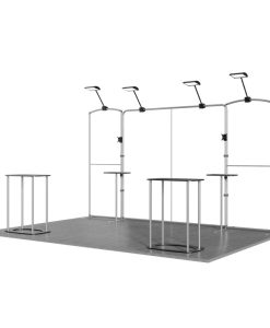 The booth is made up of 3 display racks forming a 15ft backdrop, and includes 4 adjustable 40W LED lights. The lights can switch between warm and cool tones, creating the perfect ambiance to match different themes or products. The 2 counters serve as communication points with clients and can also hold snacks, helping create a more engaging environment. The 2 TV racks support dual-screen displays, while the modular tables hold keyboards, mouse, and promotional materials, offering a dynamic way to showcase your brand.
