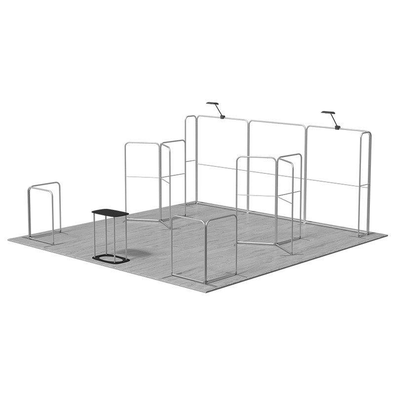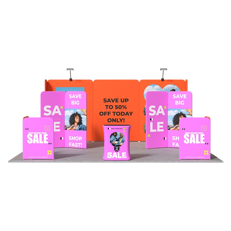 The modular design allows for unprecedented flexibility in shaping your booth layout. The 15 individual magnetic banner stands intelligently combine to form an imposing 20ft backwall, while two fan-shaped structures create eye-catching central display accents within the booth’s core. Furthermore, two right-angle displays anchor the corners, maximizing visibility from all angles. The counter serves as a perfect reception area or discussion space. Crucially, this modular nature means the components can be easily reconfigured to fit smaller booth sizes, such as 10×10 or 10×15, offering a scalable solution for your evolving exhibition needs.Durability meets convenience with lightweight, yet robust aluminum frames paired with Flame-retardant Tension Fabric. The graphic panels feature crisp, professional imagery thanks to high-quality Dye Sublimation printing, ensuring they won’t fade or deform even after repeated use. The included LED lights boast adjustable color temperatures—Cool White, Warm White, or Customized settings—allowing you to quickly change the ambiance to match any theme.
