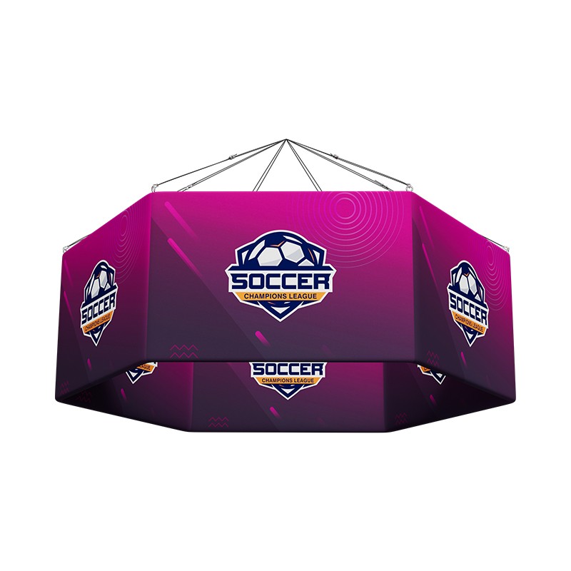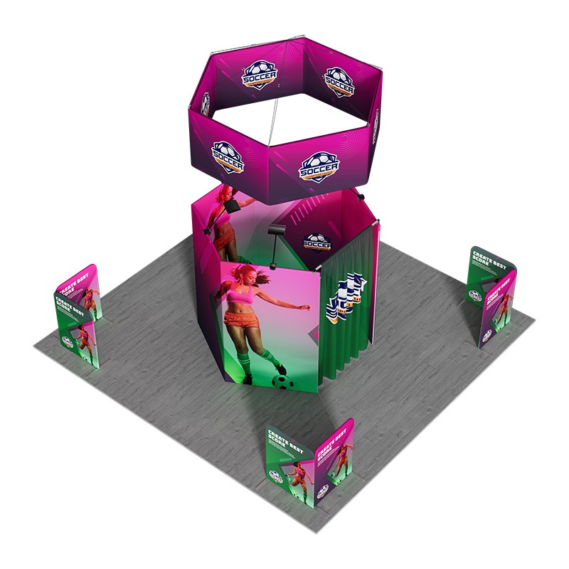 The standout feature is the synergy between the two primary hexagonal elements. The 360° viewable hexagon hanging sign acts as a beacon, positioning your brand high above the crowd. The central hexagonal enclosure complements this overhead structure, providing an immersive, fully branded backdrop—featuring an integrated custom curtain to add functional privacy for storage or VIP consultations. Furthermore, each of the enclosure’s five panels features a 40W LED light delivering an intense 6000 lumens of illumination, ensuring your graphics are always perfectly highlighted. The booth’s four corners are efficiently utilized by combining two magnetic banner stands into right-angle display, substantially increasing available surface area for messaging and product display.